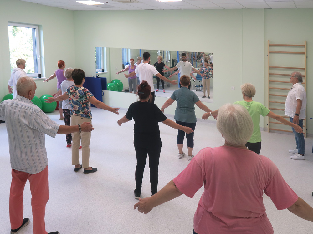 Ćwiczenia odbywają się na nowoczesnej sali gimnastycznej, gdzie pod okiem wykwalifikowanych specjalistów pacjenci mogą pracować nad poprawą swojej sprawności fizycznej.